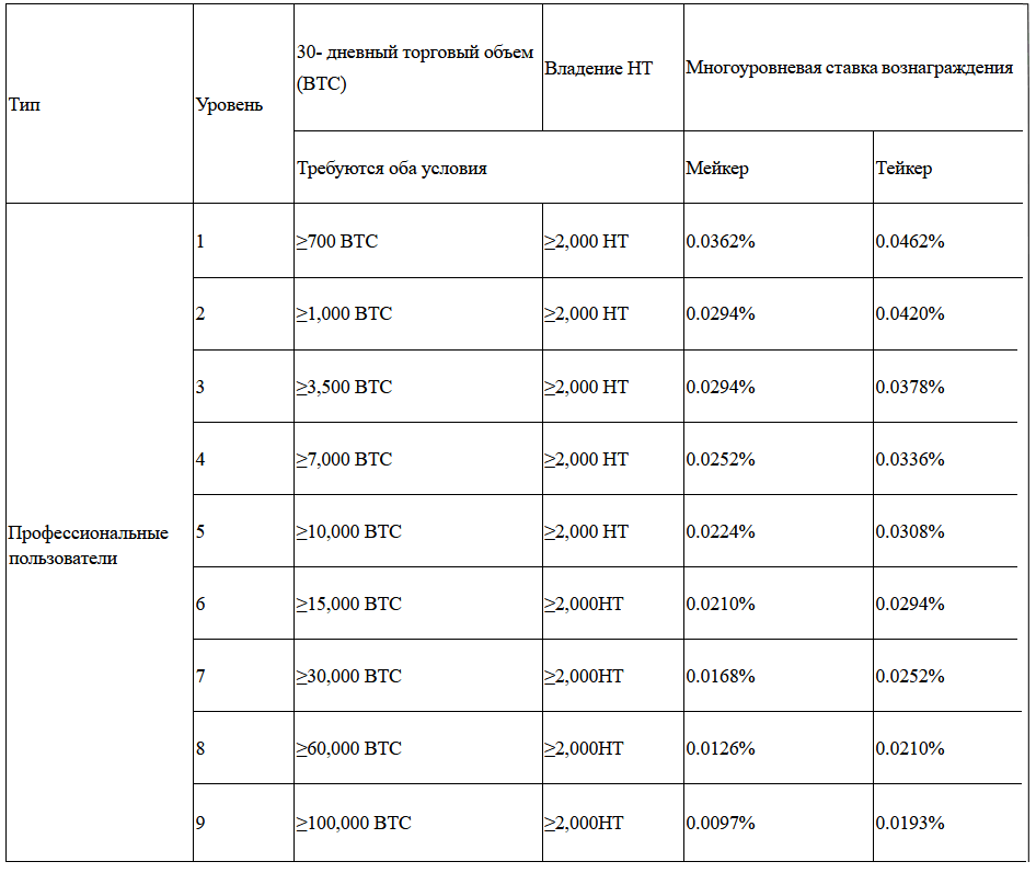 Спотовая торговля обладает интересной системой начисления комиссионных сборов, которая для рядовых пользователей может составлять 0,2% со сделки. Однако, есть возможность уменьшить её благодаря приобретению специальный HT токенов, которая может составлять от 10 до 65%. Выглядит система начисления следующим образом, указанной в таблице.