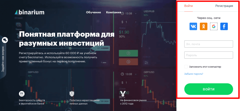 Binarium — брокер бинарных опционов с многолетней историей предоставления трейдерам доступа на финансовые площадки. В числе предлагаемых для торговли активов — валютные пары форекс и контракты на криптовалюты. Комбинируя между собой позиции с разных площадок трейдеры имеют шансы диверсифицировать свои результаты и гибко управлять рисками. В этом материале рассмотрим все имеющиеся пути логина в личный кабинет компании. Биржевым игрокам предлагается несколько методов производить вход на торговую платформу Бинариум, в том числе и с сотовых гаджетов. Многовариантность технологий торговли повышает вовлеченность трейдера в торговый процесс, увеличивая шансы на получение прибыли. Материал пригодится всем новым клиентам брокера, а также тем, кто желает получить информацию обо всех вариантах торговли в компании.
