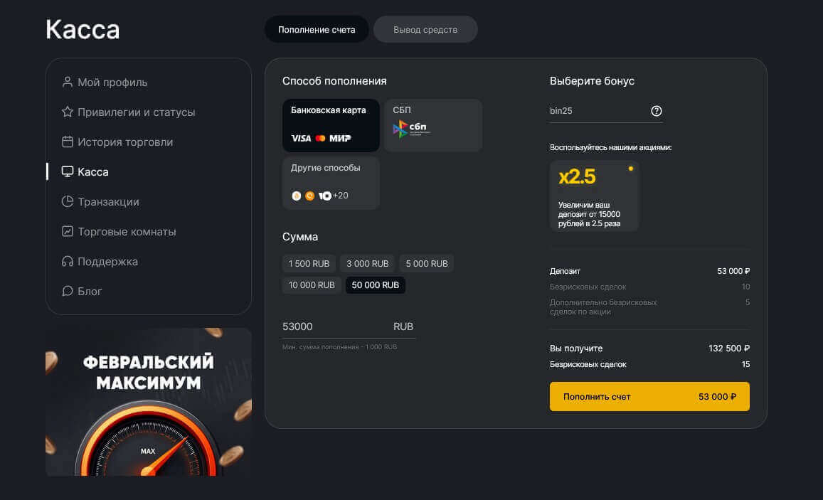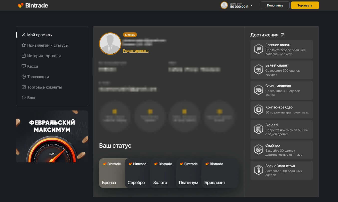 Личный кабинет BinTrade Club предоставляет пользователям удобную и функциональную платформу для управления торговой деятельностью.