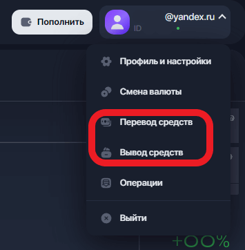 Интерфейс кабинета позволяет по ID или электронному адресу другого владельца аккаунта переводить деньги между разными счетами. Этот функционал доступен из главного меню профиля, оттуда же запрашивается вывод средств.