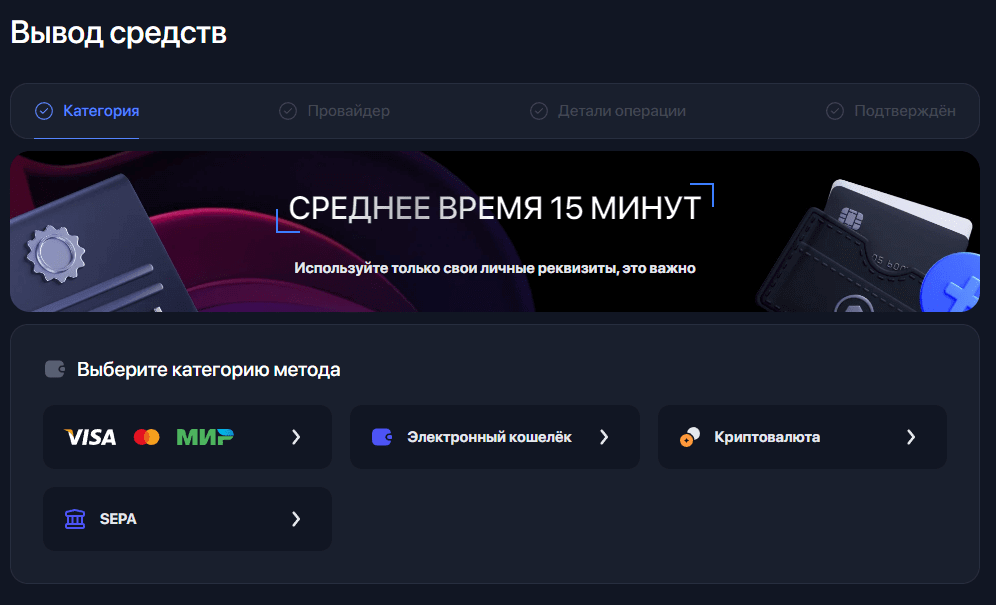 Важный нюанс – транзакция на вывод денег произойдет оперативнее только при использовании собственных реквизитов владельца, для переводов в пользу третьих лиц операция и вовсе может быть заблокирована.