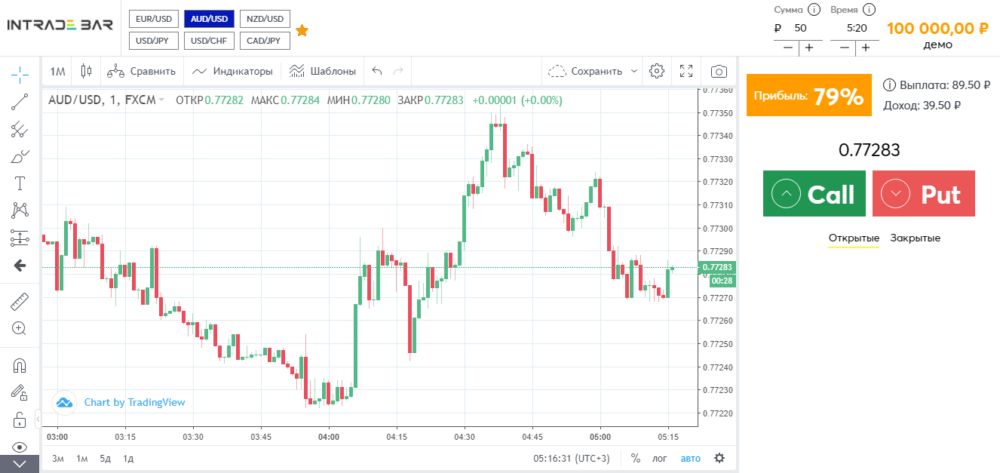 В – пятых, выставляется время опциона (задается интервал) и совершается сделка путем нажатия на кнопку «Открытие». Фиксация сделки осуществляется с помощью другой кнопки «Закрытие». Текущий мониторинг сделки производится через цифровую индикацию суммы счета (верхний правый угол).