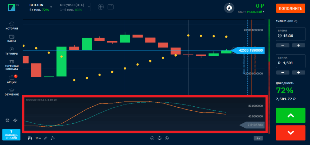 Для большей наглядности добавим стохастический осциллятор. Для его отображения предусматривается отдельное поле, создаваемое в нижней части окна. Оставим настройки по умолчанию.