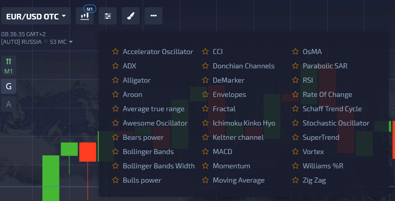 В появившемся окне отображен список всех доступных для использования индикаторов Покет Опшен. Конечно, технических инструментов гораздо больше, но часто одни являются копией или небольшой доработкой классических разработок и не несут в себе дополнительной аналитической нагрузки. Поэтому торговая платформа предлагает только самые актуальные и проверенные из них.