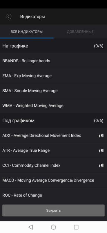 Всего в приложении для мобильных допускается использование не более 6 средств анализа, наложенных на график и такое же количество, отображаемое в отдельных областях под трендовым окном.
