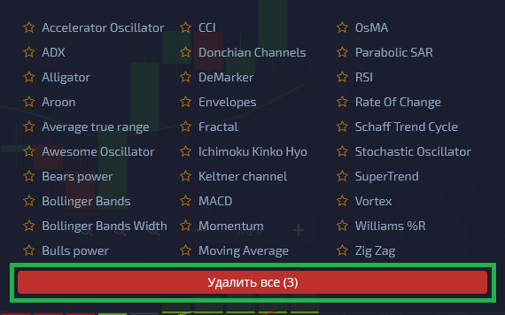 В случае, когда на один график было добавлено слишком много средств или планируется использовать другую систему исследования, из общего окна нажатием всего одной кнопки можно произвести полное удаление всех ранее добавленных.