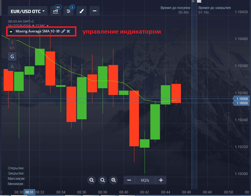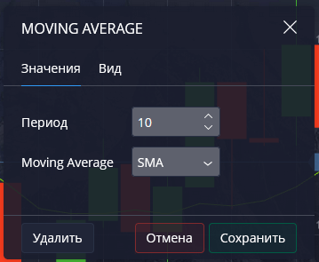 Для каждого вновь добавленного средства существует возможность временного сокрытия из области видимости (значок «глаза»), перехода в меню настроек («карандаш») или полного удаления («крестик»). Настройки варьируются в зависимости от того, какой инструмент используется. Для некоторых из доступных опций есть только выбор интервала исследования цен и визуального вида отображения, для других дополнительно допускается выбирать, например, медианный уровень, максимальные значения и т. д. В случае с рассматриваемой скользящей средней окно настроек выглядит следующим образом.