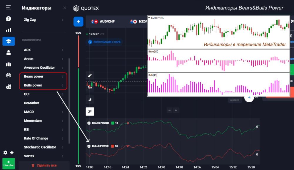 Если покупателей больше, имеем восходящий (бычий, Bulls) тренд, соответственно, доминирование продавцом приводит к падению цены (Bears, медвежий, нисходящий тренд). Видеть по индикатору как меняется баланс сил удобно, подобные инструменты есть во всех популярных торговых терминалах. Достаточно также их модификаций как для MT4, так и для QUIK.