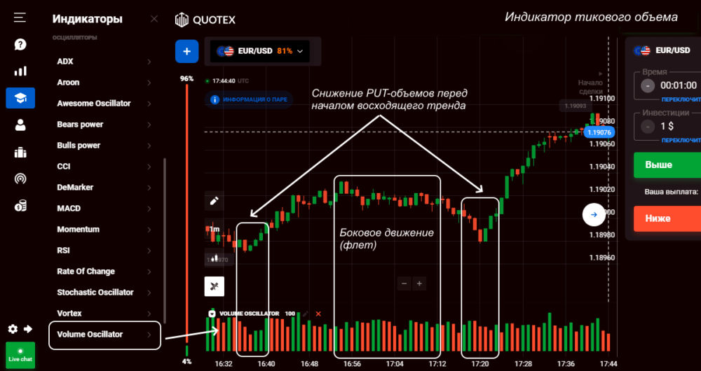 Индикатор объема Quotex