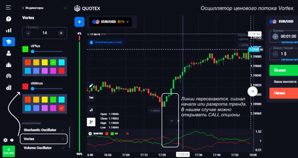 Сигналом смены торгового интереса будет пересечение линий Vortex, также нужно следить за рынком более внимательно, когда линии начинают сходиться. Описание индикатора не рекомендует менять параметры по умолчанию, но все зависит от текущей ситуации. На высокой волатильности рекомендуется увеличить периоды, так вы дополнительно отфильтруете «шум» и увидите реальный тренд.
