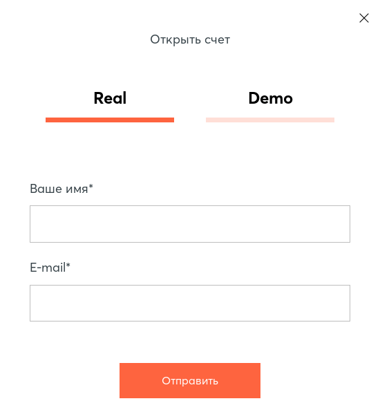 В случаях с реальными и демо-счетом для регистрации требуется заполнить два поля — имя и адрес электронной почты.
