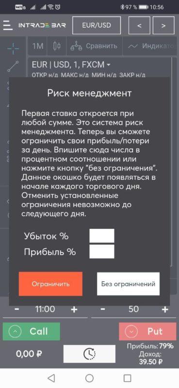 Переход в режим трейдинга осуществляется нажатием кнопки в верхней части приложения. Здесь же при первом входе предлагается настроить приемлемые уровни убытка и профита. Эти значения допускается изменять ежедневно при первом открытии терминала.
