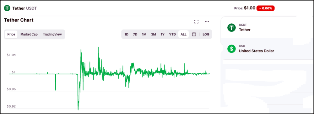 - если нет других вариантов кроме криптовалют, рекомендуем обратить внимание на Tether. В отличие от Биткоин и Эфириум у которых внутридневные колебания курса на 10-20% обычное дело, токен USDT жестко привязан к доллару и лишь незначительно отклоняется вверх-вниз. Смотрим график, на котором цена уходит от единицы максимум на несколько центов. Вы можете быть уверенными неизменности баланса даже в среднесрочной перспективе