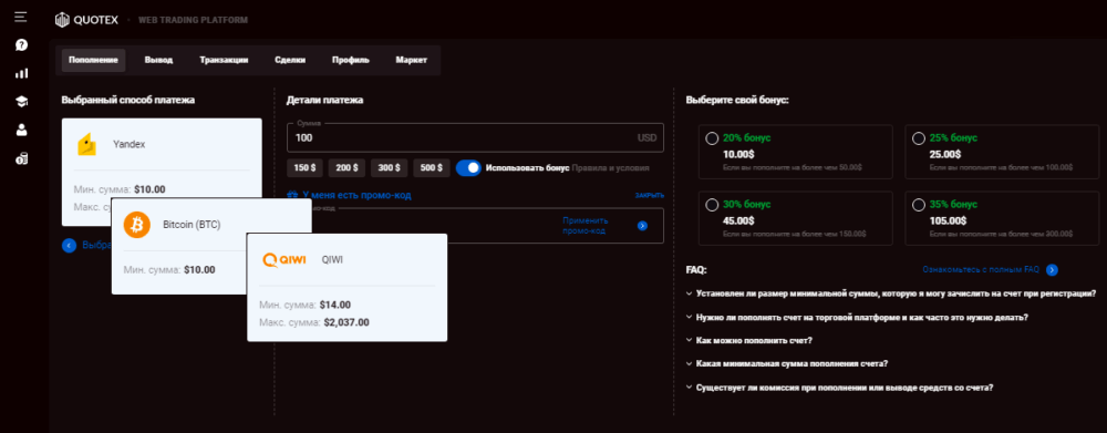 Все операции ввода/вывода внутри Квотекс идут без комиссий!