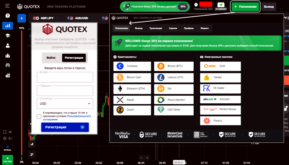 Начинающие трейдеры в обязательном порядке должны пройти период торговли на демо счете для набора опыта без риска больших финансовых потерь. Не будет демо счет лишним и для опытных игроков при смене бинарной платформы. Когда приходит уверенность в собственных идеях и стратегиях пора переходить на «реальный» рынок и давайте посмотрим, как пополнить счет Quotex – одного из самых динамично развивающихся брокеров на рынке СНГ.