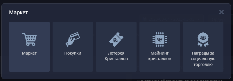 Покупая игровые кристаллы, добывая их в ходе майнинга и за выполнение определенных действий, клиенты получают возможность отмены убыточных трейдов, сокращения полученных потерь или других полезных в вопросах сохранения депозита опций. Здесь же можно увидеть полученные награды за участие в сервисе социальной торговли.