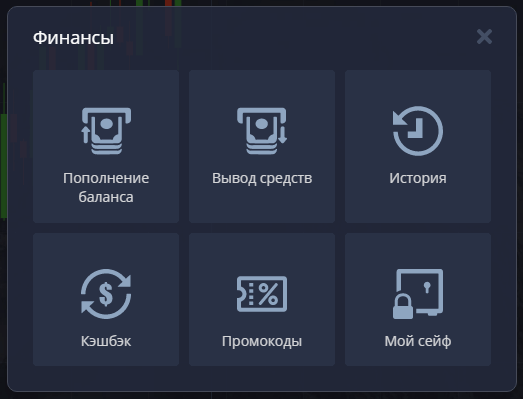 В этой части кабинета происходит работа с денежными средствами. Доступны пополнение или списание средств со счета, история уже исполненных поручений, работа с кешбэк сервисом и использование имеющихся промокодов.