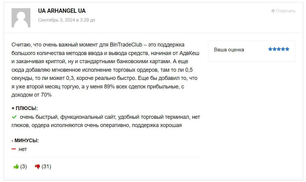 Множество пользователей выделяют большое количество способов для ввода и выводе денег. Кроме всего прочего имеется возможность по моментальному исполнению активных ордеров из-за большой ликвидности. Всё это делает сервис одним из лучших на рынке. Вот один из ярких отзывов от пользователей, которые говорят об этом.