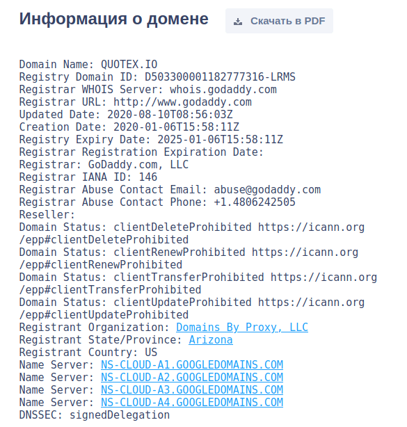 Необходимо обратить внимание, что ресурс зарегистрирован и оплачен до 2025 года. В отличие от многих лже-брокеров однодневок, владельцы Квотекс планируют надолго задержаться на финансовом поприще. Страна регистрации — США, что также подтверждает серьезность намерений Квотекс. У сомнительных участников в этом поле часто числятся оффшорные адреса, а то и африканские страны.