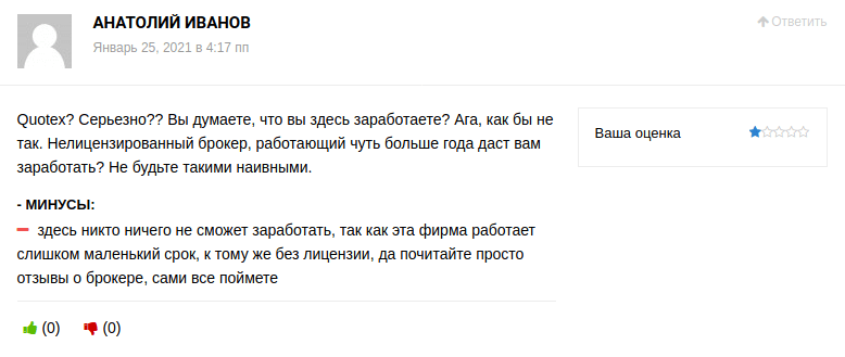 Завершает обзор мнение другого посетителя. Судя по всему, у автора нет ни малейшего опыта торговли через Quotex. Указывается об отсутствии лицензии, тогда как на официальном сайте представлена вся необходимая информация. Предлагается сделать вывод, развод или нет работа здесь на основе отзывов других людей. А в них, по примеру рассмотренных выше, как раз указано, что выплаты производятся и зарабатывают здесь те, кто готов приложить усилия к созданию собственной торговой системы и четкому следованию ее сигналам при практическом совершении операций на рынке.