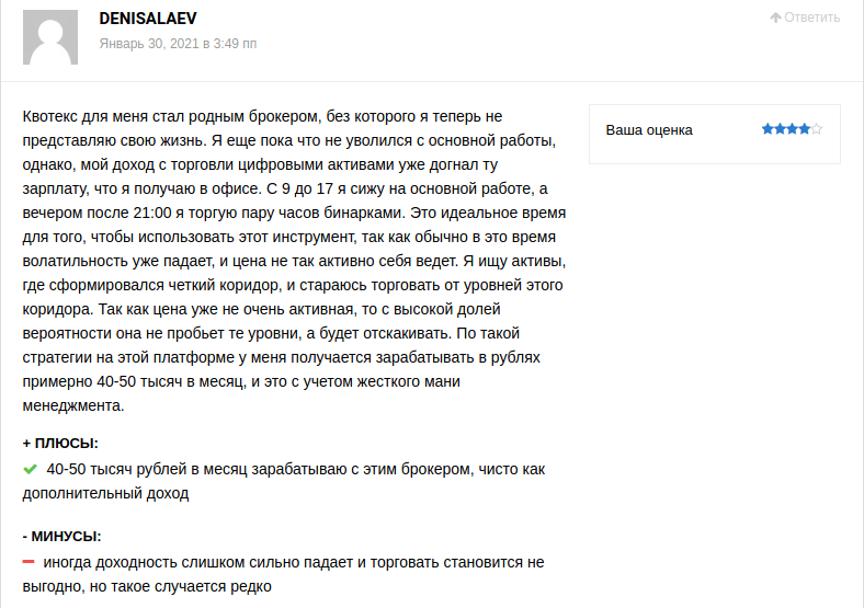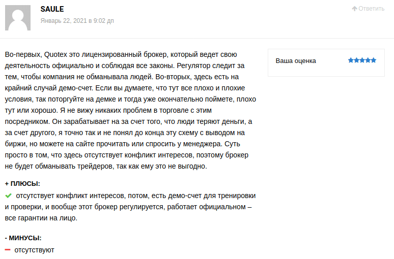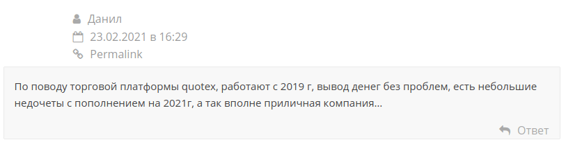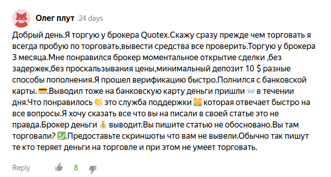 Следующий отзыв о брокере Квотекс получен с одного из многочисленных сайтов финансовых «аналитиков», на поверку не имеющих к финансам никакого отношения. Автор отзыва, противопоставляя свой опыт информации создателя материала, указывает, что торгует в компании продолжительное время. Перед тем, как вложить крупную сумму, попробовал провести пополнение и вывод на небольшом объеме денег и все прошло удачно. Часто негатив на прогрессивную компанию — заказной материал от конкурентов с еще большими репутационными рисками. Всего за пару лет Quotex зарекомендовал себя надежным партнером, исправно выплачивающим деньги клиентам. Здесь же отмечена и высокая скорость вывода — автору деньги на карту пришли в течение 1 дня.