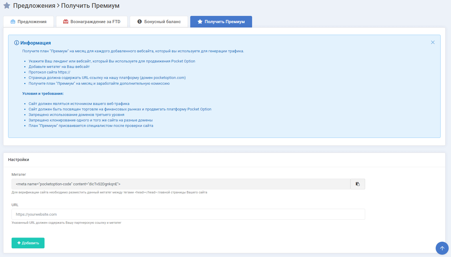Владельцы веб-сайтов, используемых для генерации трафика, могут получить для своих ресурсов премиальный план, если владелец приведет его в соответствие с несложными требованиями брокера. Таким образом стать успешными могут даже площадки, не имеющие прямого отношения к миру финансов и биржевой деятельности. Основной фактор – высокая проходимость ресурса.
