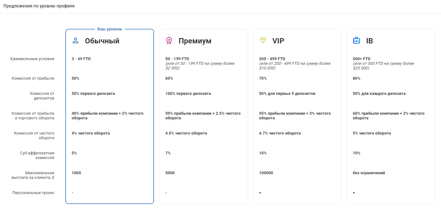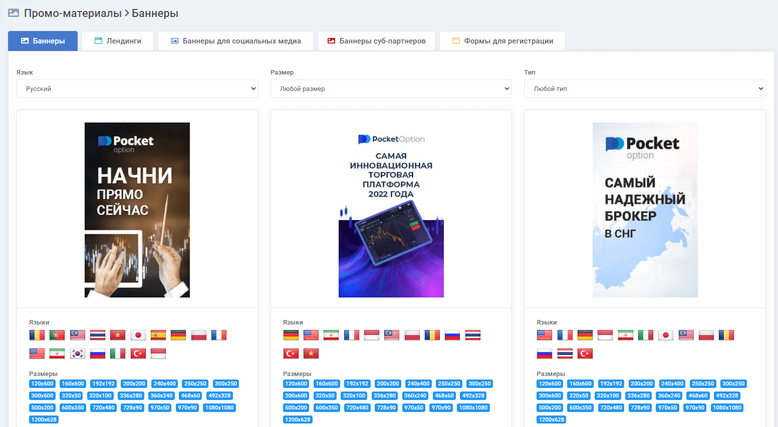 Но и рядовым партнерам не стоит опускать руки – в разделе «Промо-материалы» персональной страницы есть множество баннеров, лендингов и регистрационных форм, которые можно размещать на своих ресурсах и страницах в социальных сетях, повышая число FTD день за днем, и таким образом повышая свой уровень профиля, а главное – увеличивая потенциальную прибыль.