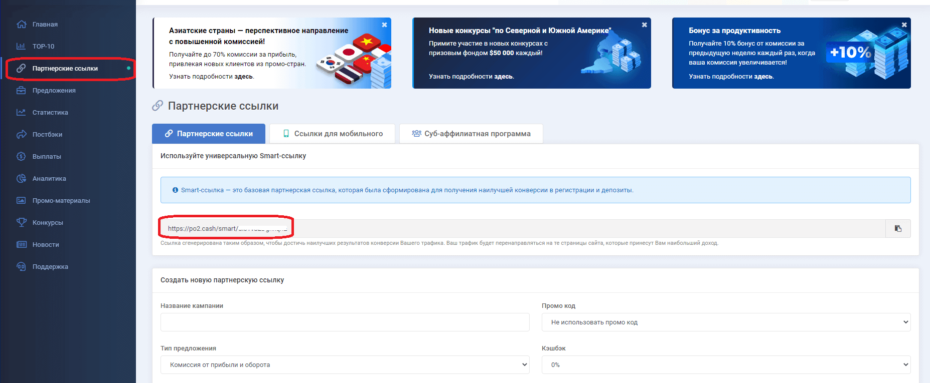 - Войдя в личный кабинет, переходим в раздел «Партнерские ссылки» и получаем Smart-ссылку, которая будет перенаправлять пользователей на страницы, после изучения которых они с большой долей вероятности захотят начать свой собственный путь в трейдинге. По умолчанию генерируется именно такой тип, хотя каждый участник может самостоятельно создать новое уникальное приглашение. Таким образом можно регулировать активности в различных клиентских группах. Существует отдельный вид приглашений для пользователей мобильных устройств и суб-аффилиатов, которых в проект пригласил уже существующий участник.