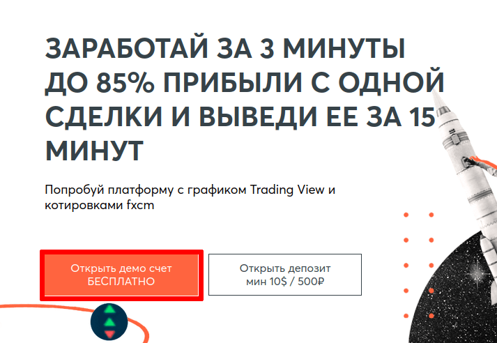 Отдельно стоит отметить торговлю на демо — аккаунте. Для этого достаточно нажать на соответствующую кнопку на главной странице сайта и пройти процедуру получения доступа к демонстрационному счету. Все рыночные данные и функционал программы при этом полностью сохраняются, но торговля происходит на условные денежные единицы. Такой режим — отличное подспорье не только для начинающих, но и тех биржевых игроков, кто желает получить в свое распоряжение систему тестирования стратегии, не подвергающей риску потери денежные средства.