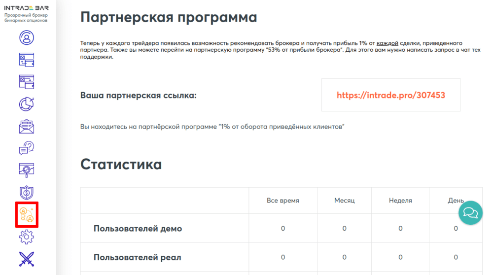 - Раздел партнерской программы. Приглашая других трейдеров к открытию аккаунта, существующие клиенты могут получать процент от их оборота, дополнительно обеспечивая себя пассивный доход. Здесь каждому участнику программы представлена подробная статистика по количеству проведенных регистраций новых аккаунтов и накопленный на момент просмотра профит. Хочешь стать партнером брокера Intrade.Bar регистрируйся прямо сейчас по данной ссылке!