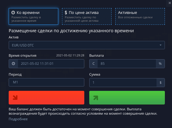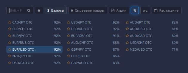 - выбирать тип используемого актива. Доступны инструменты из групп валютных пар, криптовалюты, сырьевых активов, акций. По каждому активу отображается доходность при верном определении направления экспирации.