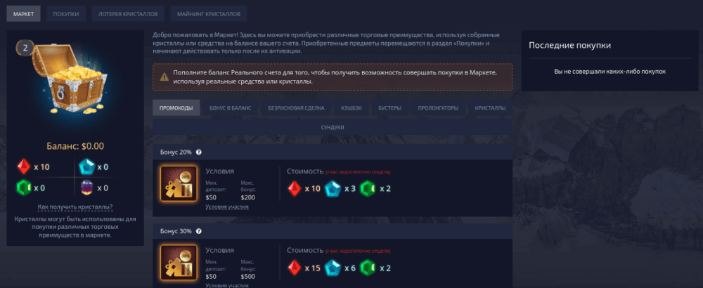 Кристаллы выдаются и за определенную активность. Подробный список вознаграждений за активное участие в трейдинге представлен в соответствующем разделе.