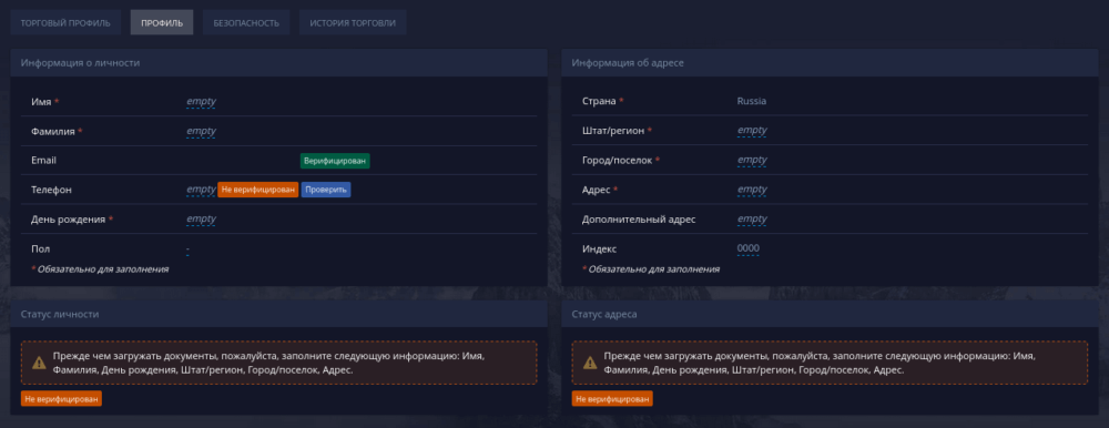 Как уже говорилось ранее, важно обеспечить соответствие указанной в личном профиле информации и официальных документов. При прохождении верификации, а для торгующих на постоянной основе биржевых игроков этот процесс обязателен, брокер запрашивает определенный пакет документов, которые необходимо загрузить для проверки. Проверка проходит по следующим направлениям — данные личности и адреса фактического проживания. Перед предоставлением документов необходимо предварительно заполнить обязательные поля профиля и только затем произвести загрузку подтверждающих документов.