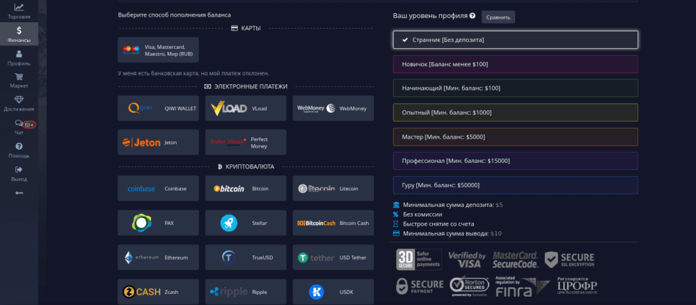 При выборе пополнения счета произойдет переход на соответствующую страницу. Предлагаются следующие каналы увеличения депозита: