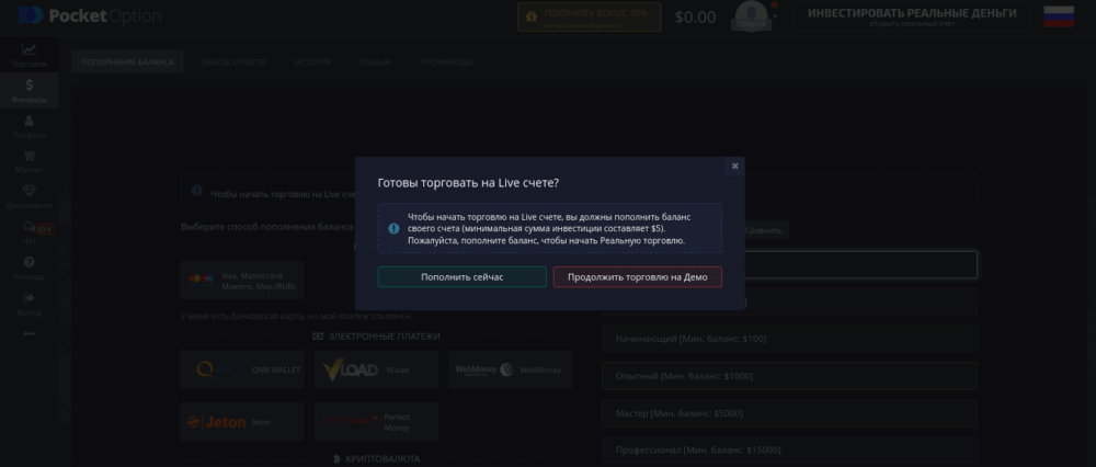 При отсутствии положительного баланса будет предложено провести пополнение, либо продолжить осваивать азы на демонстрационном аккаунте.