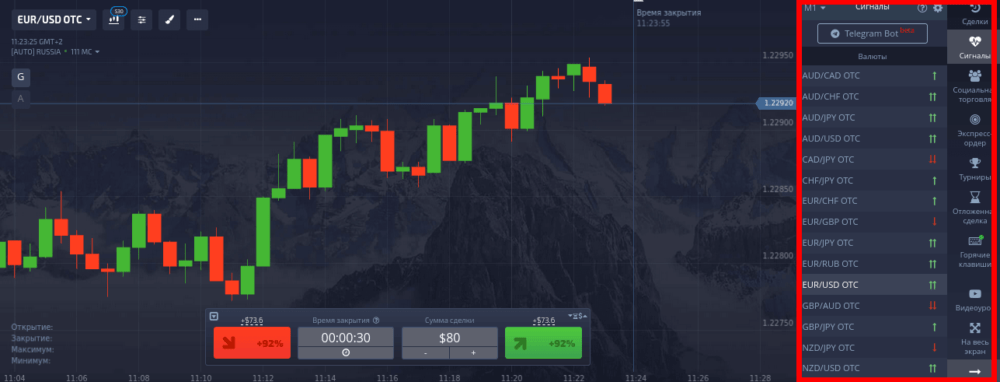 Еще одна полезная секция — сигналы к открытию сделок. Соответствующая кнопка располагается в правой области основного окна и предлагает активным трейдерам возможность использования аналитических знаний сотрудников брокера в своих целях. Для каждого отображаемого инструмента предлагается интервал экспирации позиции и предполагаемое направление движения графика. С помощью подобных рекомендаций извлекать прибыль от работы с бинарными контрактами смогут даже абсолютные новички.