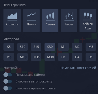 - выбора типа графика, его таймфрейма и дополнительных опций (отображение таймера, включение автопрокрутки и привязки к сетке программы). Доступны 4 наиболее часто используемых типа тренда — тиковый, баров, свечной и Heiken Ashi. График может отображаться с периодом от 5 секунд до одного дня.
