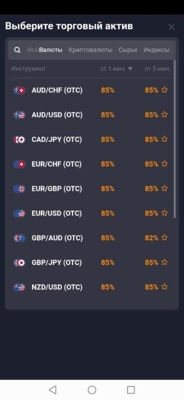 Изменить торгуемый актив можно из левой части торгового окна — при нажатии на соответствующий значок открывается список из всех доступных для трейдинга групп активов — валютных пар, криптовалют, сырья, индексных активов. Помимо названия инструмента, Quotex.io отображает информацию о предлагаемых доходностях.
