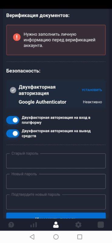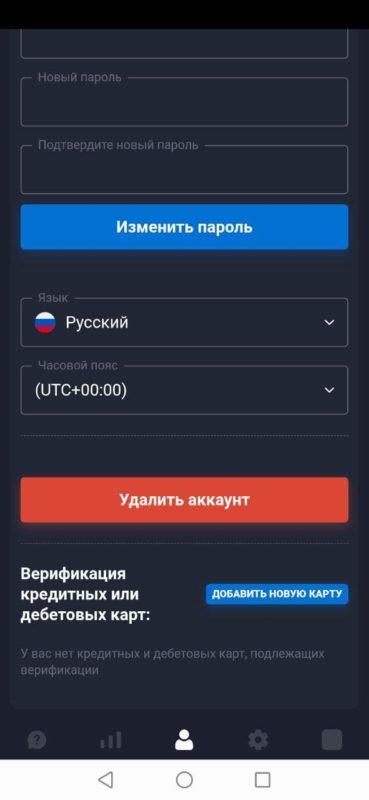 Здесь же предлагается при необходимости произвести смену пароля и добавить банковскую карту, если планируется использовать этот способ пополнения и вывода в качестве основного.