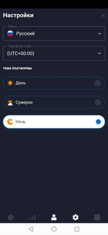 Последняя доступная опция в этом разделе — цветовое оформление. В зависимости от личных предпочтений, биржевой игрок может выбрать один из трех основных цветов программы — черный (ночь), серый (сумерки) или белый (день).