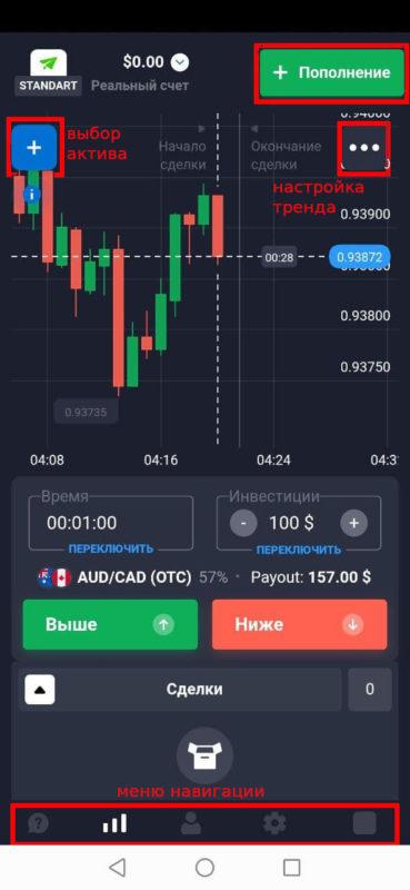По умолчанию после успешной авторизации открывается окно проведения операций. Подробно возможности выбора активов рассмотрим далее, ниже представлен скриншот, на котором выделены наиболее значимые области — меню выбора торгуемого инструмента, графика, пополнения баланса и навигации по разделам. Здесь же производится смена активного аккаунта между реальным и демонстрационным. Подробнее о работе на демо рассказывается в статье по ссылке.