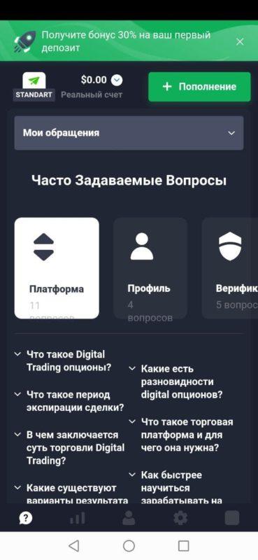 Для новичков будет полезен раздел с часто задаваемыми вопросами — из него можно извлечь много полезной информации, как касательно теории трейдинга, так и непосредственно совершения сделок на рынке.
