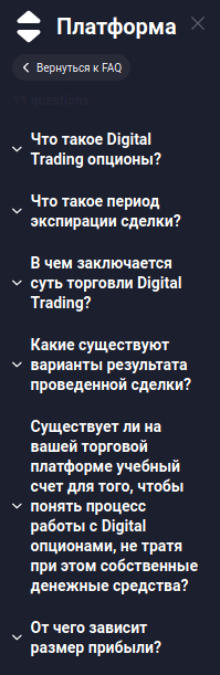 Для помощи новым клиентам, не имеющим опыта реальной деятельности, в приложении открыт раздел помощи с наиболее актуальными вопросами, ответы на которые помогут начать свой путь на рынках.