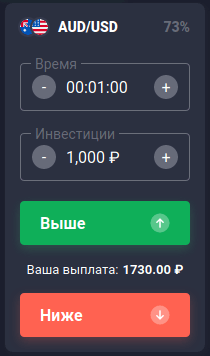 Еще одно преимущество бинаров — прибыль известна заранее. В случае с указанной выше валютной парой по австралийскому и американскому долларам, потенциальный профит составил 73%.
