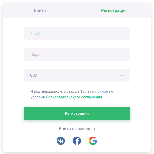 Чтобы получить доступ к проведению операций, достаточно пройти процесс регистрации. Для этого предлагается ввести следующие данные: