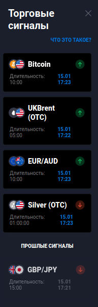 Биржевых игроков без опыта привлечет раздел «Сигналы» от Квотекс. В нем предлагаются профессиональные сигналы для открытия ордеров по разным инструментам и самыми разнообразными конфигурациями. По одним активам может быть предложено выставить позицию с минутным интервалом. Тогда как для другого инструмента следом может появиться предложение о входе на более долгосрочном промежутке. Каждый владелец аккаунта сможет выбрать для себя подходящий прогноз и использовать его. Аналитики Квотекс обещают точность до 87%. С таким высоким показателем можно и вовсе отойти от самостоятельного анализа, используя лишь предлагаемые прогнозы.
