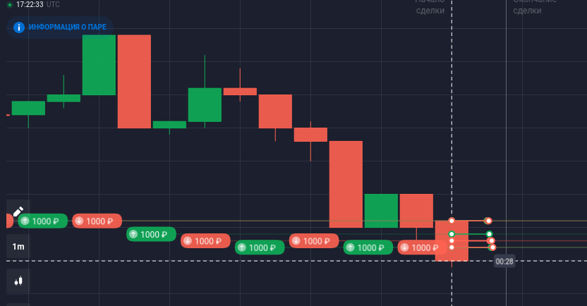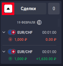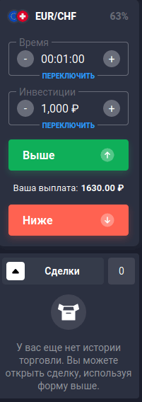 - выбора направления позиции — выше или ниже цены в момент экспирации. Следом располагается окно истории совершенных сделок.