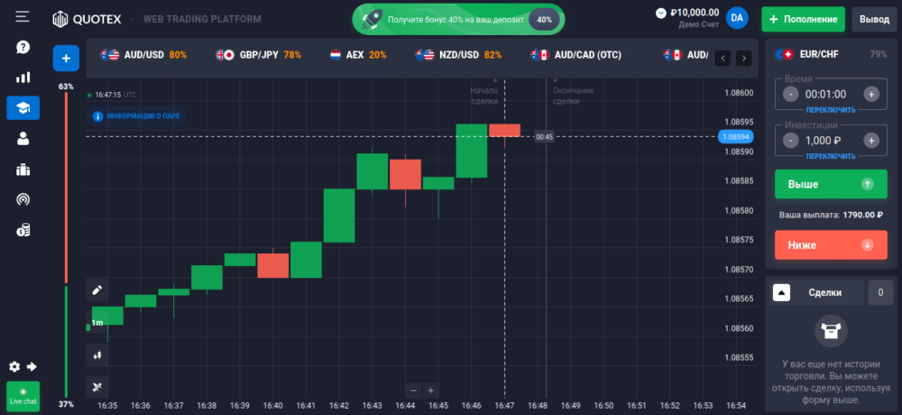 Интерфейс раздела Quotex Demo Trade интуитивно понятно подскажет, как торговать онлайн. Но впервые пришедшим на рынок «бинаров» может быть непривычен.