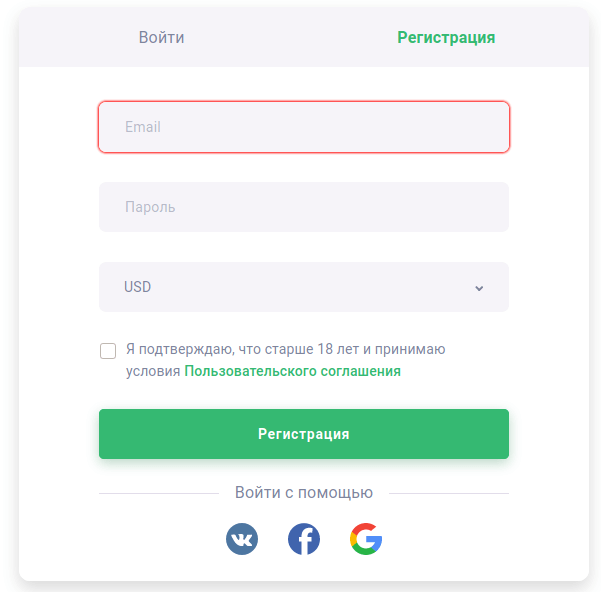 Для получения счета с использованием адреса электронной почты переходим по кнопке «Регистрация» на главной странице.