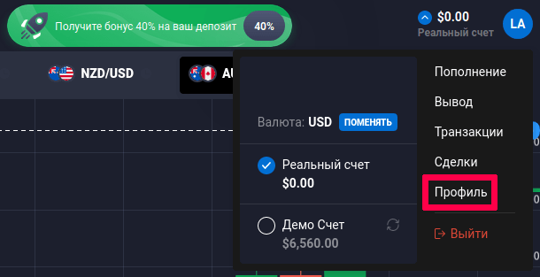 После ввода информации и нажатия на кнопку оформления, трейдер переход в интерфейс личного кабинета, а на электронную почту направляется письмо с подтверждением открытия аккаунта. Остается заполнить профиль для последующего прохождения верификации, если того потребует Квотекс. Нужно обратить внимание — все вводимые данные должны в точности соответствовать настоящим, потому как их проверяют при верификации с данными из загружаемых документов. И отказ в успешной проверке счета чаще всего бывает связан именно с указанием недостоверной информации. Заполняются данные в разделе «Профиль» из основного меню счета в верхней части окна.